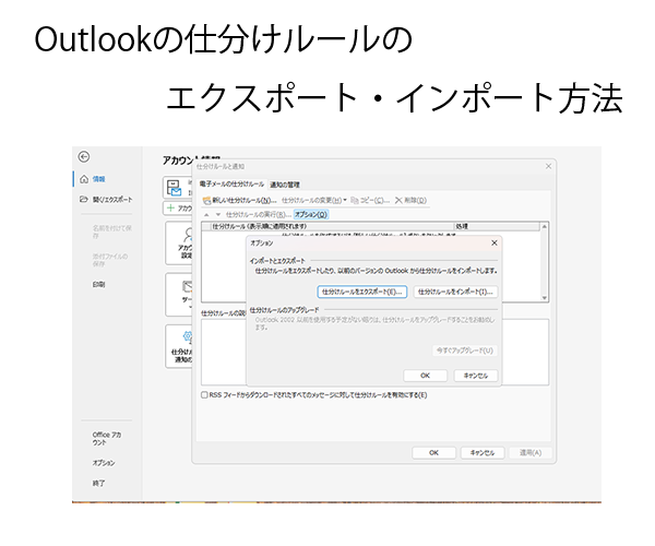 皆さんは業務でメールを使用される際、メールの仕分けルールを作成し、業務の効率化を図られているかと思います。 しかし、新しいパソコンに切り替えたり、別のPCでも同…