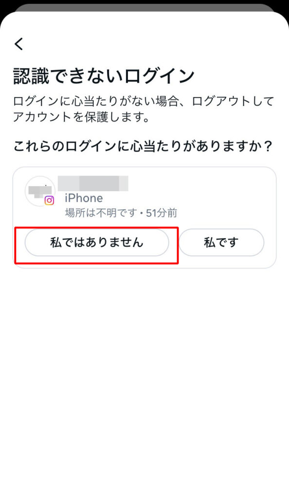なお、こちらに不明なログインの検出があった場合「デバイスを確認」をタップしログインに心当たりのある端末でなけれ「私ではありません」をタップし、パスワードを変更します。