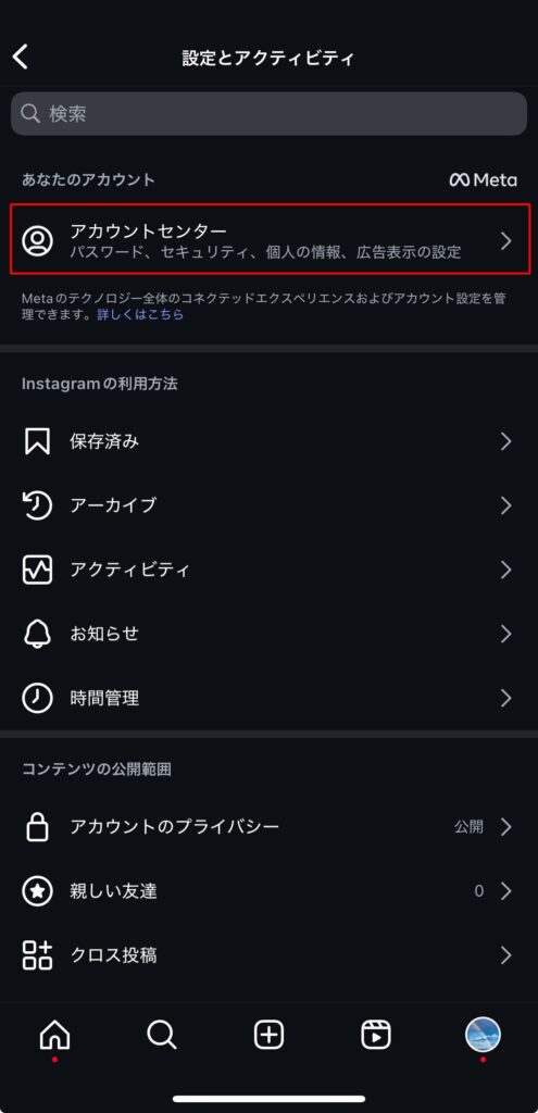 STEP1.Instagramアプリの「設定」→「アカウントセンター」タップします