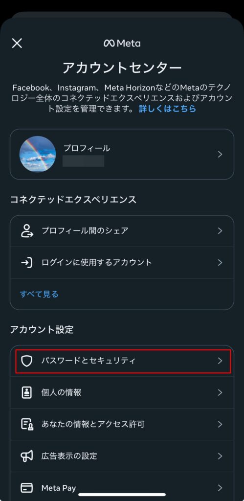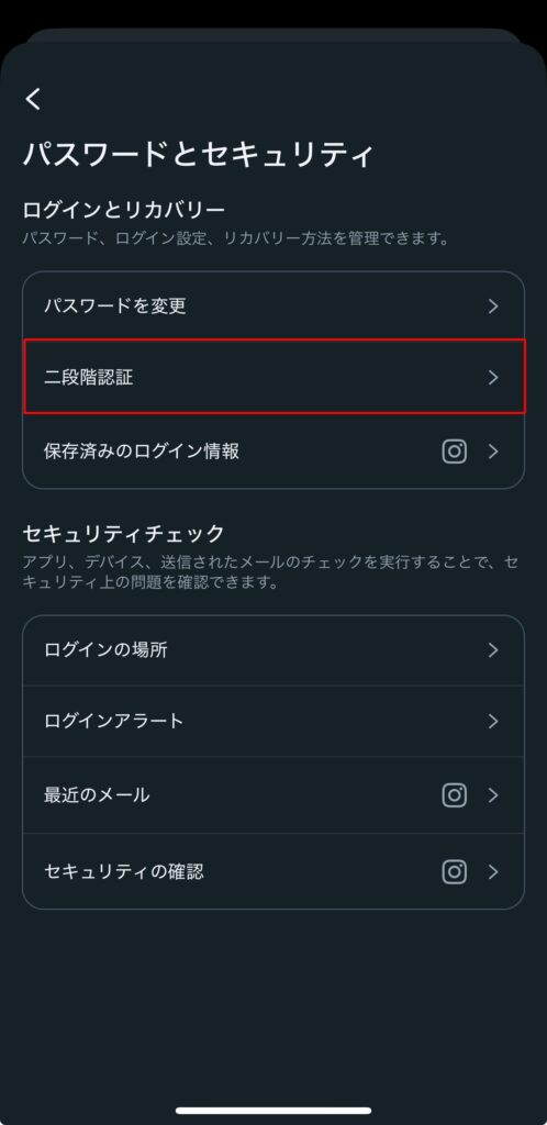 STEP1.「設定」→「アカウントセンター」の「パスワードとセキュリティー」→「二段階認証」をタップします。