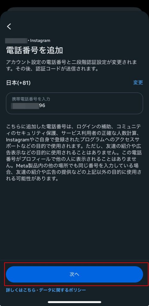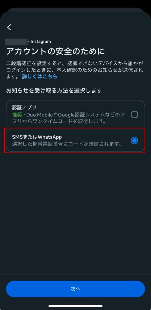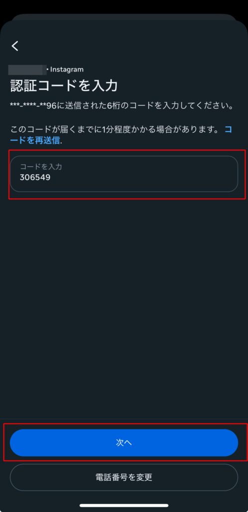 STEP4.登録した電話番号へSMS経由で認証コードが届くので、そのコードを入力し「次へ」をタップします。