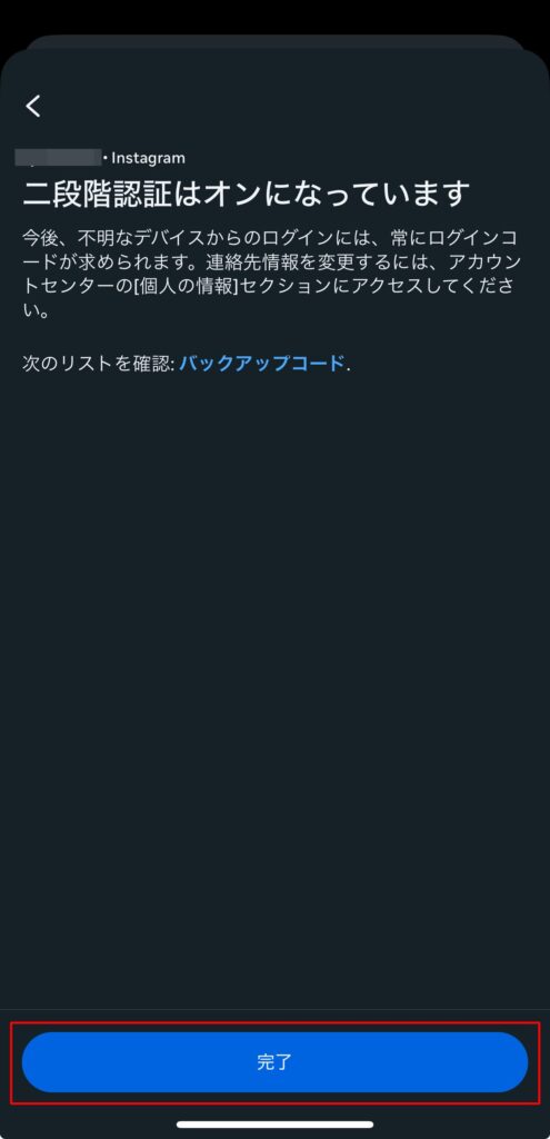 STEP5.「二段階認証はオンになっています」という画面が表示されるので「完了」をタップして設定は終了です。