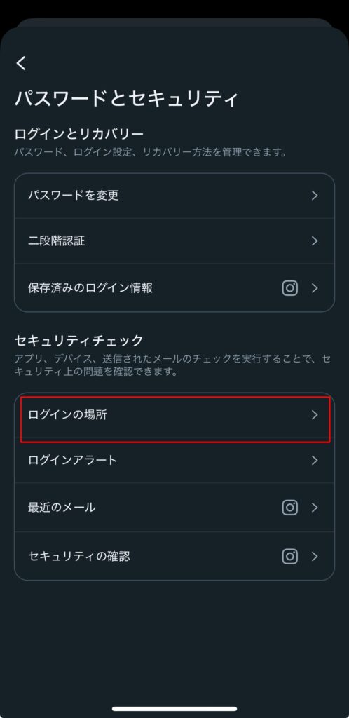 STEP2.アカウント設定の項目内の「パスワードとセキュリティー」→「ログインの場所」をタップします。