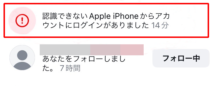 Instagramから「新しい端末からログインされました」といった通知が届いていないか確認。
