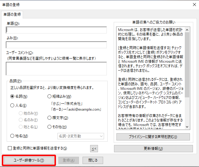 STEP2.左下の「ユーザー辞書ツール」をクリックします。