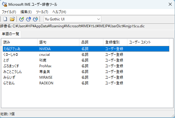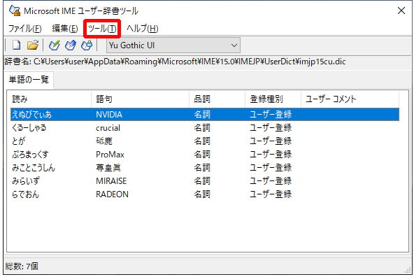 STEP6.ユーザー辞書ツール画面に戻ったらインポートしたユーザー辞書の内容が反映されているか確認をします。