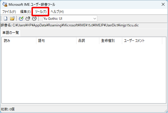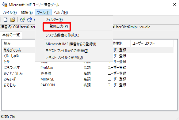 STEP3.ユーザー辞書ツール画面のメニューから「ツール」 → 「一覧の出力」 を選択する