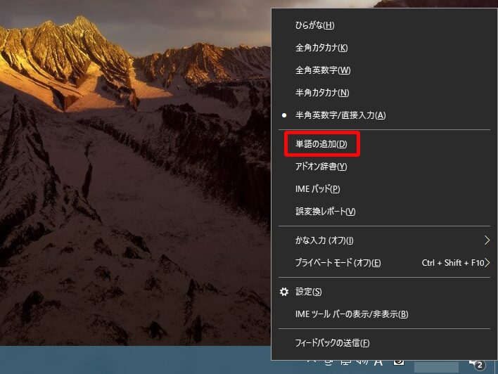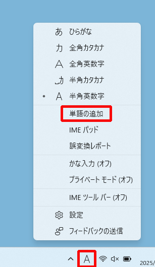 STEP1.画面右下の「A」または「あ」と表示されている箇所を右クリック→「単語の追加」をクリックします。
