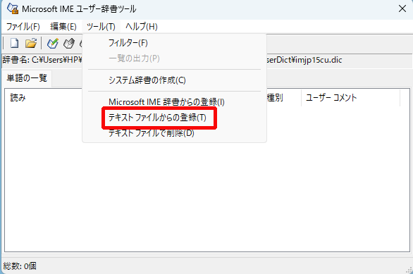 STEP3.ユーザー辞書ツールのメニューで「ツール」 → 「テキストファイルからの登録」 を選択