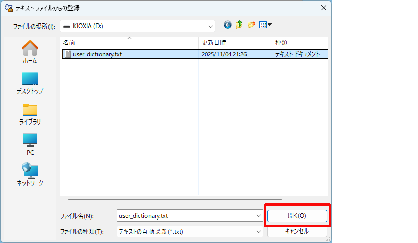 STEP4.エクスポートの際にUSBメモリに保存した「user_dictionary.txt」ファイルを選択し、「開く」をクリックする。