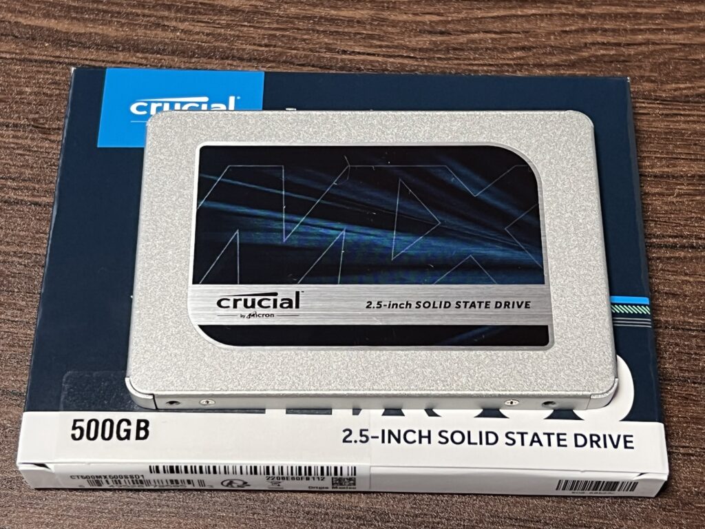 今回使用したCrucialの500GBのSSDです。
