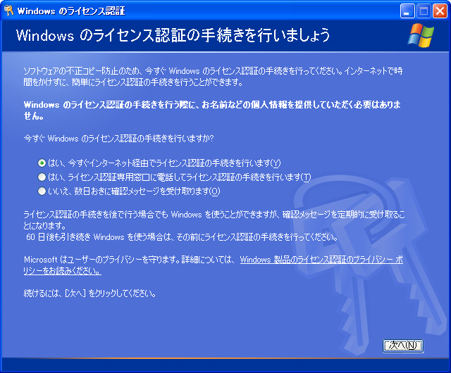 XPは既に公式サポートが終了しているのでラインセンス認証を求められてもアクティベーションできるか心配でしたが、2022年8月時点でも電話でライセンス認証が行えるとのことでした。